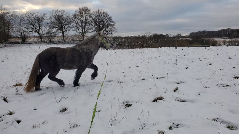 Normalerweise bin ich ja ein stets gut gelaunter Ritter. Aber manchmal bin ich dann doch genervt. Gestern zum Beispiel. Ich meine: es war doch Sonntag! Und Sonntag ist doch Ausflugstag! Aber nix war´s. Die Straßen und Wege sind vereist, gefroren und insgesamt ungemütlich, mein Mädchen war nur sehr mittelmäßig motiviert und also haben wir versucht, etwas Handarbeit auf dem gefrorenen Reitplatz zu machen. Das ging aber wirklich nicht so irre gut und ich hatte wenig Lust. Am Abend kam mein Mädchen dann nochmal und meinte, ein bisschen in der Halle im Kreis laufen könnte meine Laune heben. Aber das hab ich in letzter Zeit so oft gemacht…. alles öde. Mein Mädchen wusste also: Not am Mann, der Ritter hat Burgkoller! Da sie aber das Wetter nicht bestimmen kann, hat sie nach einem Ausweichplan gesucht. Und einen gefunden! Auf unserem „Sommerreitplatz“, da ist nämlich noch hohes Gras und etwas Schnee oben drauf und da, hat sie sich gedacht, kann man bestimmt gut laufen. Also hat sie mich mitgenommen und mich auf dem Sommerreitplatz longiert (und das mitten im Winter!). Ach, das hat mir gut getan. Endlich mal wieder frei raus traben, ein bisschen galoppieren durfte ich auch, aber vor allem meine Kraft sinnvoll nutzen. Denn auf dem Sommerreitplatz geht es immer rauf und runter. Rauf, runter, rauf, runter, Richtungswechsel, rauf, runter….. und mein Mädchen einigermaßen faul in der Mitte (weil SIE mit dem Boden nicht so toll klar kommt. Aber egal, Hauptsache ich kann mich bewegen!). Ich wollte ja noch weitermachen, aber nach einer halben Stunde meinte sie, das würde wirklich reichen (pah! Ich war gerade mal knapp warm geworden!) und wir würden das demnächst wiederholen (ich bitte doch sehr darum, wenn wir schon nicht ausreiten gehen können). Außerdem hat sie mal wieder angemerkt, ich sei ein komisches Pony, weil ich Longe so gern mag. Alle anderen Ponys die sie bisher so hatte, haben keinen Sinn darin gesehen, im Kreis um den Menschen rum zu laufen. Ganz ehrlich: ich würde auch mehr Sinn darin sehen, meinen Menschen geradeaus durchs Gelände zu schleppen, aber wenn das nun mal so gar nicht im Angebot ist, was soll ich machen? Dann lieber im Kreis mal ordentlich laufen, als immer nur in der Halle rumdümpeln.