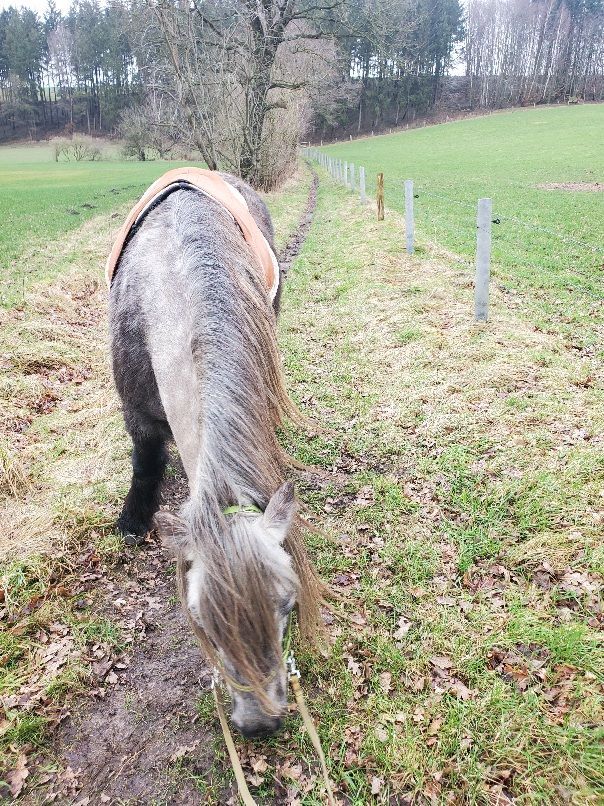 Heute hat das dann endlich mal wieder alles gestimmt! Mein Mädchen hatte schon so ein Gefühl. Sie hat mir meine Schuhe angezogen, weil sie meinte, es könnte heute so weit sein. Und ich hab das auch gemeint. Sie hat mich angezogen und dann hat es noch ewig gedauert, bis es wirklich los ging, weil sie erst dem Mann Bescheid gesagt hat, dann hat sie noch ihr Headset eingepackt und das Mädchen vom Schimmelfreund informiert, dann nochmal Nase putzen, Handy starten, durchatmen…. und endlich ist sie auf den Hocker geklettert. Ich hab sie gleich passgenau abgeholt und dann ging es los! Ich hatte richtig Bock und bin los marschiert wie ein Großer. Links vom Hof (rechts mag ich ja nicht so) und dann einfach so, als hätten wir nie was anderes getan. Mein Mädchen hat sich sicher gefühlt und mir gesagt, dass ich das so toll mache, dass sie sich sicher fühlt. Ich hab mich auch sicher gefühlt. Dann kamen wir an den Baum. Da haben wir ja bisher immer eine Graspause gemacht, da habe ich mein Mädchen dran erinnert, aber sie hat nein gesagt. Doch! Nein! Wir gehen jetzt weiter! Menno. Na gut. Ein kleines Stückchen Trab (mein „kleiner“ Trab, gut mit Pad zu sitzen für mein Mädchen und so ruhig, dass sie nicht das Gefühl hat, es könnte mit mir durchgehen). Dann kam eine Spaziergängerin mit einem Hund, der hatte so eine reflektierende Decke an, da hab ich kurz geguckt, aber im Grunde stört mich sowas ja nicht. Und schon waren wir an der Eiche! Das ist quasi der „point of no return“, denn danach kommt der schöne Grasweg. Mein Mädchen hat überlegt, ob sie akustische Unterstützung braucht. Deswegen hatte sie nämlich das Headset mit, dann hätte sie das Mädchen vom Schimmelfreund angerufen und sich mit ihr unterhalten, damit ihr Kopf nicht so viele dumme Dinge denkt. Aber nach einer kurzen Überlegung hat sie gemerkt: ihr Kopf denkt gar keine dummen Dinge. Sie ist entspannt und ich bin es auch und wir genießen unsere Zweisamkeit. Also ging es den Grasweg entlang, an den guten Stellen im Trab, an den allzu glitschigen Stellen im Schritt. Ich hab super aufgepasst und alles richtig gemacht. Dann kamen wir auch schon an den Dornröschenweg. Den findet mein Mädchen ja immer etwas gruselig, weil der so schmal ist: links Stacheldraht, rechts eine Baumreihe, hinter der ein Wassergraben liegt. Kein Platz für nix! Aber wir waren beide so gut drauf, dass sie gesagt hat, wir kriegen auch das hin. Und ich bin ja ein Schmalspurpony, ich komme eigentlich überall gut durch. Also hab ich sie da durch getragen und danach haben wir eine Graspause gemacht. Während ich Gras geschmaust habe, stand mein Mädchen neben mir und hat ein Foto für den Mann (und für euch) gemacht. Sie hat dem Mann das Foto geschickt und ganz viele Herzchen drunter gemacht, damit er weiß, dass wir schon so weit gekommen sind und alles gut ist.
