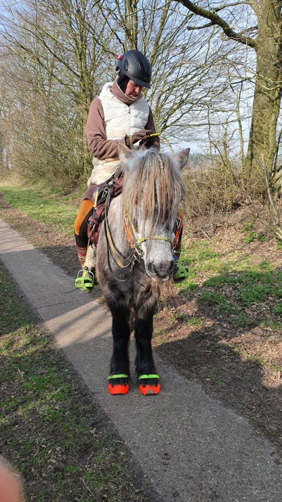Es fing etwas merkwürdig an, weil die Menschen meine Hufschuhe aufgepimpt haben und ich dafür ungefähr 100 mal die Schuhe an – und wieder ausziehen musste. Langsam wurde mir ganz kribbelig: gehen wir irgendwann auch mal ausreiten? Ja, gehen wir. Als die Schuhe fertig waren und dann noch mit bunter Farbe besprüht, damit man sie besser sieht, haben die Menschen endlich die Sachen gepackt und wir durften in die Wackelkiste klettern.