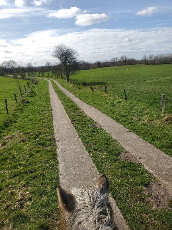 Ein Stück weiter haben wir eine schöne Graspause eingelegt, wir Ponys durften das wunderbare Frühlingsgras verkosten, während die Menschen sich entpelzt haben, weil es doch wärmer war als gedacht. Als sie fertig waren, ging es weiter, schön im Trab bzw in meinem Fall im Galopp mit Übergängen. Trab, Galopp, Trab, Galopp, Trab, Galopp, wie am Freitag. Aber leider waren die schönen Wegstücke immer nur recht kurz, so dass wir alsbald wieder Schritt gehen mussten. Das ist so auf die Dauer ganz schön anstrengend sage ich euch! Immer lange Füße machen und trotzdem nicht hinterher kommen, dann ein kleines Stück Trab, wieder durchparieren…. uff.