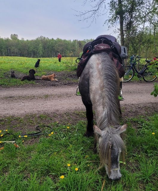 Dann ging es los! Mein Mädchen dachte, ich finde das vielleicht alles komisch. Aber ganz ehrlich: das Mädchen vom Ausreitkumpel kenne ich doch schon seit einer Ewigkeit (genaugenommen seit dem Tag an dem ich bei meinem Mädchen eingezogen bin) und ich weiß, dass sie in der Lage ist, mir und meinem Mädchen zu helfen, wenn es Not tut. Also bin ich einfach ganz entspannt mitgegangen. Wir sind dann auch ganz fein getrabt und mein Mädchen war hoch zufrieden mit mir. Und mit sich selbst war sie auch zufrieden, weil sie nicht ganz so aufgeregt war und es jetzt schafft, mir mehr Sicherheit zu geben, wenn ich etwas komisch finde. Als ich gerade so richtig schön warmgelaufen war, war dann plötzlich Graspause angesagt – an einer ganz anderen Stelle als sonst! Aber egal, Hauptsache da ist was Grünes zum Futtern für mich.