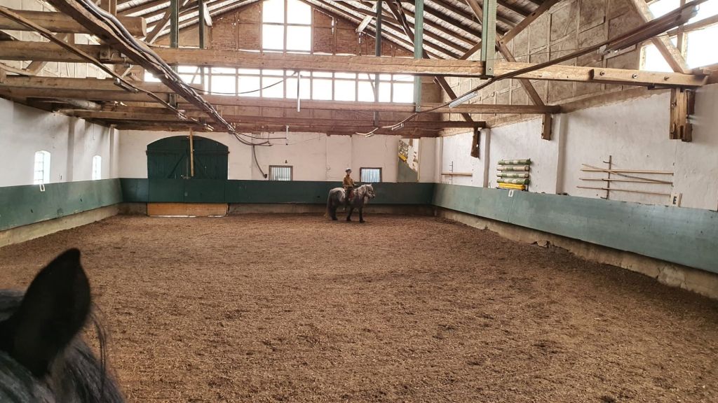 Und gestern war dann Spezialausflug angesagt. Wir sind ziemlich lange in der Wackelkiste gewesen und dann auf einem Hof wieder ausgestiegen. Hier sollen wir Ende Juni an meinem ersten richtigen Reitkurs teilnehmen! Mit dem Reitlehrer von meinem Mädchen, den sie normalerweise nur im Ohr hat, weil er so weit weg wohnt. Jetzt kommt er mal hierher und diese Chance will mein Mädchen sich nicht entgehen lassen. Und weil sie weiß, dass sie dann aufgeregt sein wird und dass das für meinen Kopf alles sehr, sehr anstrengend wird, hat sie sich gedacht, sie zeigt mir schonmal den Hof dort. Da gibt es eine kleine Reithalle, die fand ich voll spannend. Spiegel sind da, da tauchen ständig schöne Ponys drin auf und verschwinden wieder! Außerdem musste ich alles abschnüffeln was es da zu sehen bzw zu riechen gab. Diego war natürlich wieder völlig ungerührt. Wie macht er das nur? Egal wo man hingeht, er kennt sich überall aus, weiß über alles Bescheid und verliert niemals die Fassung. Wie kann man nur so cool sein?