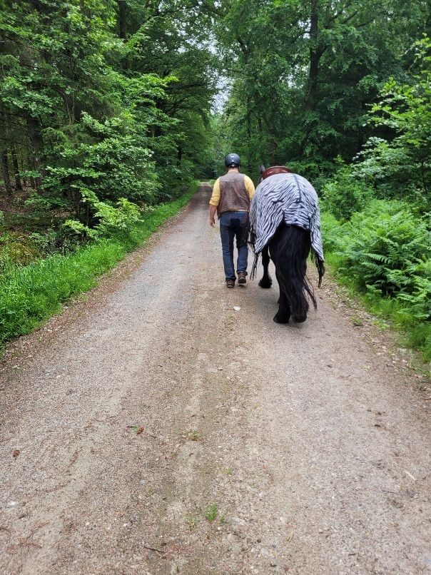 Mein Mädchen hatte vergessen, mir meine Hufglocken anzuziehen, also war angaloppieren strengstens verboten, denn dann trete ich mir ja immer in meine Schuhe und verdrehe mir die. Da musste ich mich im Trab ein bisschen beeilen, hab ich aber geschafft! Dann kurze Schrittpause, dann noch ein ausgiebiger Trab. Einmal bin ich dann doch kurz in den Galopp gefallen und mein Mädchen hat runter geschielt und gesagt, jetzt ist der Schuh verdreht. Es traf sich aber ganz gut, denn wir waren eh schon da, wo wir traditionell Graspause machen. Da konnte mein Mädchen schnell den Schuh wieder geraderücken.