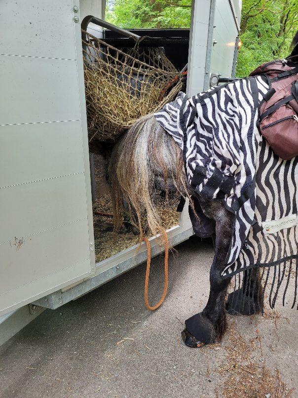 Nach guten 9km waren wir dann auch schon wieder an der Wackelkiste. Man, hatte ich einen Hunger! Dieser flotte Schritt ist ganz schön anstrengend, sage ich euch. Schnell schon mal etwas Heu naschen, während mein Mädchen mich absattelt. Sie meinte dann aber, dass ich doch lieber von hinten durch die große Tür in die Wackelkiste einsteigen soll. Ok, Hauptsache ich komme ans Buffet!