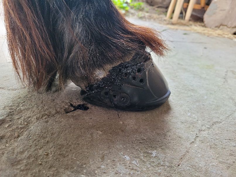 Da wir ja nun hoffentlich auch wieder so richtig flott mit dem Ausreitkumpel losziehen können, hat mein Mädchen es nochmal mit dem Kleben versucht. Der letzte Bekleb wollte ja einfach nicht halten. Jetzt hat sie etwas anderes probiert, nämlich die Schalen von meinen Hufschuhen an meinen Hufen festzukleben. Dann brauche ich diesen Ballenhalter hinten am Huf nicht mehr, wo ich mir immer reintrete, weshalb ich dann den Schuh verliere. So also der Plan und schon ging das Gefummel und Gefrickel wieder los: Hufe schön sauber machen, ordentlich abschleifen, trocken föhnen, Staub runter bürsten. Kleber in die Schalen, Schale an den Huf halten, kurz warten, absetzen. Und wer musste dabei die ganze Zeit ihm wahrsten Sinne die Füße still halten? Richtig: ich. Zum Glück gab es Kekse. Mein Mädchen hat – wie immer – gejammert, dass sie alles hasst, was mit Kleber zu tun hat. Eigentlich wundert sie sich, dass sie nicht bis heute einen Tisch aus der Grundschule an ihren Fingern kleben hat, weil sie das noch nie konnte. Diesmal klebten nur die Einmalhandschuhe an meinem Huf, aber zum Glück hat sie sie wieder abbgekommen, sonst hätte das doch recht peinlich ausgesehen. Jedenfalls war sie im Anschluss ganz zufrieden mit ihrem Werk, auch wenn es zugegebenermaßen eher …. kreativ aussieht.