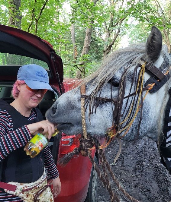 Aber eine blöde Wendung nahm es dann doch noch: Mein Ausreitkumpel hatte einen Hufschuh verloren! Was war zu tun? Die Mädchen haben sich abgesprochen, das Mädchen vom Ausreitkumpel ist zurück gelaufen und mein Mädchen hat uns Ponys versorgt. Abschwammen, alles ins Auto einpacken, nochmal Puls messen (der war runter auf 60, also alles im grünen Bereich), noch unsere Fliegendecken mit Wasser tränken damit wir schön abkühlen können und dann durften wir in die Wackelkiste. Wir sind ja so gute Ponys, man kann uns auch allein sehr gut versorgen.