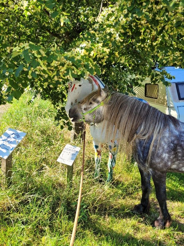 Morgens zu einer ganz unüblichen Zeit kam mein Mädchen und hat Diego aus dem Stall geholt. Warte mal, der geht ja in die Wackelkiste! Da will ich aber mit! Und tatsächlich, ich durfte mit. Schnell einsteigen da vorne ist Heu! Nein, erst warten. Warum denn? Hufe auskratzen. Jetzt aber schnell! Nein, nochmal warten. Was denn jetzt noch? Einmal den Staub abbürsten. Oooooooor Mädchen mach hinne, Diego futtert mir ja alles weg! Unsere helfende Hand, das Mädchen vom Schimmelfreund, hat sich totgelacht über mich, weil ich es so eilig hatte. Schließlich durfte ich einsteigen und es ging los. Alsbald waren wir angekommen und sollten aussteigen. Aber vorne war noch Heu, da haben wir es nicht so eilig…. haben uns dann aber überreden lassen. Da war Gras, das ist ja auch fein, und wir durften essen. Aber da stand schon einer!