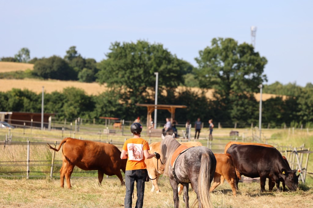 Am Nachmittag wurde es dann ganz wild. Da haben wir nämlich Rinder getrieben! Erst war eine Gruppe Reiter dran, die haben die Rinder von der kleinen Koppel uns gegenüber auf eine größere Koppel getrieben. Ich hab mir das ein bisschen angeschaut aber dann beschlossen, dass essen doch auch sehr wichtig ist. Und dann waren wir dran und ich dachte, ich hätte doch mal genauer zuschauen sollen! Von mir als Pony wird erwartet, dass ich auf diese großen, böse guckenden Tiere genau zu gehe und angeblich gehen die dann weg, weil sie Respekt vor mir haben! Also bei Diego klappt das. Aber der ist ja auch so viel größer und beeindruckender als ich! Ich war da jetzt nicht so ganz sicher. Und ehrlich gesagt: mein Mädchen auch nicht. Sie ging zu Fuß neben mir und hat versucht, mir Sicherheit zu geben, aber wenn wir zu nah an die Rinder gekommen sind, hatten wir beide bisschen Muffensausen. Reitlehrer Alex hat mich dann an die Hand genommen und ist mit mir da hin gegangen. Der war sich sicher, aber wisst ihr was? Der ist ja auch so viel größer als ich! Ich war nicht ganz überzeugt. Wenn die Rinder sich komisch bewegt haben, hab ich mich doch immer etwas erschreckt und bin mal kurz in den Fluchtmodus gegangen. Die anderen Pferde hatten das besser raus, aber die Menschen haben gesagt, ich hab das trotzdem alles toll gemacht. Nachher sind wir dann mit mehreren Pferden im Kreis um die Herde herum gegangen, das konnte ich gut. Da ist mein Mädchen dann auch aufgestiegen und geritten und wenn ein Mensch am Boden mir geholfen hat, konnte ich auch mal so ein Rind anschauen und es ist dann auch tatsächlich weg gegangen.