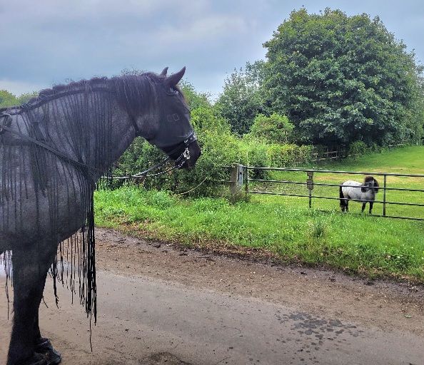 Weiter ging es also durchs Dorf zu unserem zweiten Lieblingsweg. Den wollte mein Mädchen gern traben, weil da so viele Fliegviecher unterwegs sind, die uns ans Blut wollten. Aber es stellte sich heraus: da ist einer mit dem Trecker durchgefahren! Und jetzt ist der Weg kaputt. Matschig und rutschig und nicht mehr trabtauglich. Schade! Stattdessen hat aber das Mädchen von Willibald für große Erheiterung gesorgt. Beim durchreiten unter einem tiefen Ast hatte sich nämlich die Fliegenschutz-Decke an Willis Hals gelöst und nun wollte sie die gern wieder festmachen. Aber Willis Hals ist verdammt lang, da kommt man nicht mal so eben vorne an! Mein Mädchen hat versucht, während dem Lachen noch zu filmen, aber das ist nur so halb gelungen. Dann hat sie wieder festgestellt, dass kleine Ponys sehr, sehr große Vorteile haben und sich bei jedem Zweig gefreut, dass sie sich nur etwas ducken musste, während Willis Reiterin gründlich geduscht wurde. Die Zweige waren nämlich alle nass vom Regen. Da es sehr warm war, war das eher erfrischend als ärgerlich.