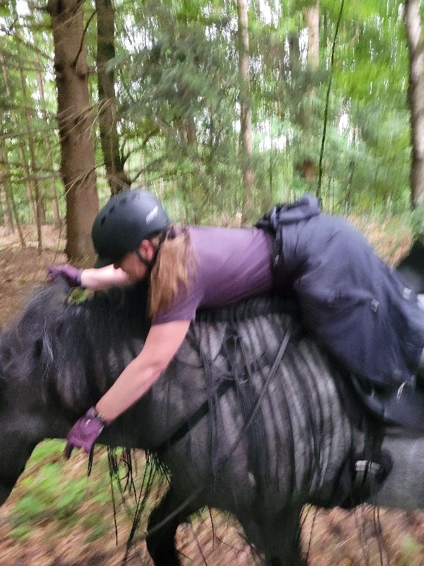 Weiter ging unsere Woche am Mittwoch. Am Dienstag hatte mein Mädchen nämlich Geburtstag und hat sich einen Tag „Pony-frei“ genommen, hat einen Ausflug mit dem Mann gemacht. Na gut, sei es ihr gegönnt. Morgens hat sie allerdings erstmal Geschenke bekommen und da ging es natürlich doch wieder um Ponys! Der Mann hat ihr nämlich einen Sattelhalter fürs Auto gebaut. Da hatten sie bisher so eine Stange die sie ins Auto geklemmt hat, Sattel drauf und hoffen dass er hält. Und dann war die Stange immer gerade etwas zu kurz für zwei Sättel, das ist ärgerlich. Also fand der Mann, es sei Zeit für eine bessere Lösung und hat meinem Mädchen etwas tolles gebaut! Jetzt ist der Sattel viel besser untergebracht und fällt nicht mehr runter. Abenteuer wir kommen! Naja, am Dienstag war wie gesagt kein Abenteuer für mich. Aber am Mittwoch kam mein Mädchen gleich morgens an und hat mich fertig gemacht für das nächste Abenteuer. Ab in die Wackelkiste und dann zu einem unserer liebsten Wege. Dort haben wir Ritter Willibald getroffen! Den kenn ich ja nun schon. Dem wollten wir zwei unserer Lieblingswege zeigen. Vom ersten war er auch gebührend angetan. Wir sind schön getrabt und sogar zusammen galoppiert und mein Mädchen fand mich hochanständig, weil ich mir das mit dem Wettrennen verkniffen habe. Sind wir ehrlich: Willi ist derzeit nicht gut im Training, ich weiß dass ich ihn hätte abhängen können…. aber mein Mädchen möchte keine Wettrennen reiten und ich bin ja Gentleman.