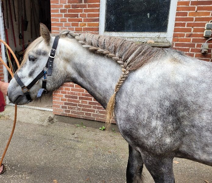 Lange Rede, kurzer Sinn: ich hatte keinen Ausreitkumpel für heute. Aber jetzt sind wir ja schon groß, mein Mädchen und ich, und können allein los. Meinte mein Mädchen. Erst hat sie meine neuen Hufschuhe für hinten angepasst mit Hilfe des Mannes. Der hat mir dann noch – in seiner Funktion als mein persönlicher Coiffeur – das Wallehaar gerichtet und mir einen wunderschönen Zopf geflochten, weil unter der Decke sonst immer alles durcheinander kommt und sich verzottelt.