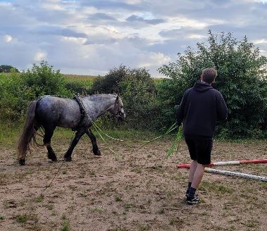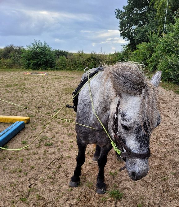 Ich habe einen neuen Lehrauftrag: ich unterrichte jetzt Doppellonge! Weil ich das schon so gut kann. Da kam ein junger Mann, der möchte mit dem Pony seiner Freundin gern sportliche Sachen machen, hat aber noch keine Ahnung wie. Und für sportliche Sachen bin ich ja zuständig, das ist ja allgemein bekannt! Also ging es los. Beim ersten Termin kam es mir vor, als würde der Typ chinesisch sprechen. Ich hab immer zu meinem Mädchen geguckt und die hat mir übersetzt, was er meint. Trotzdem war ich ein bisschen aufgeregt und hab deswegen immer doll nach dem Grünzeug am Reitplatzrand gehascht. Aber ansonsten weiß ich ja, im Zweifel lieber langsamer werden und nachfragen.