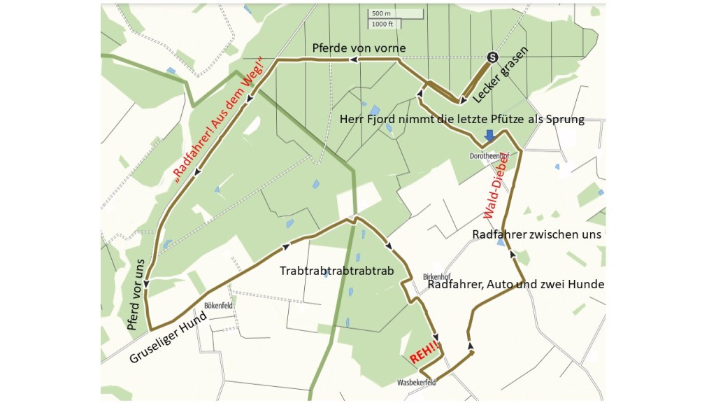Unsere Mädchen fanden, wir haben das alles toll gemeistert, mit den vielen Menschen die da unterwegs waren, wo sonst nie jemand ist. Noch ein letzter Trab, eine letzte Pfütze – diesmal hatte Herr Fjord eine neue Idee und wagte einen Sprung darüber, was sein Mädchen einen kurzen Moment aus der Fassung brachte – dann den letzten Kilometer Schritt zu Fuß. Herr Fjord war etwas außer Atem, deswegen fand sein Mädchen, er sollte noch etwas verschnaufen bevor er in die Wackelkiste steigt. Mein Mädchen hat dann – ponyfreundlich wie sie nun mal ist – vorgeschlagen dass sich ja anbieten würde, uns etwas grasen zu lassen. Ich war zwar überhaupt nicht außer Atem, fand den Vorschlag aber super und habe mich direkt in die leckeren Brombeeren gestürzt, während Herr Fjord etwas krüsch im Gras herum gewühlt hat, bevor er etwas fand, was er essen mochte. Wir haben also noch ein paar Minuten geschlemmt, bevor es dann wieder in die Wackelkiste ging und ab nach hause. Gute 14km in knapp über 2 Stunden haben wir geschafft und mein Mädchen war ganz erstaunt, denn der Ritt kam ihr sehr gemütlich vor. Früher waren 7km/h Durchschnitt schon recht flott, aber jetzt ist das eine ganz entspannte Nummer. Ich war fit und fidel bis zum Schluss und schon hatte mein Mädchen gute Laune, weil das ganze Fitness-Training eben doch was gebracht hat. Kopfmüde war ich auch nicht, trotz all der Menschen, die da unterwegs waren. Also alles fein und ich bin wieder der Held!