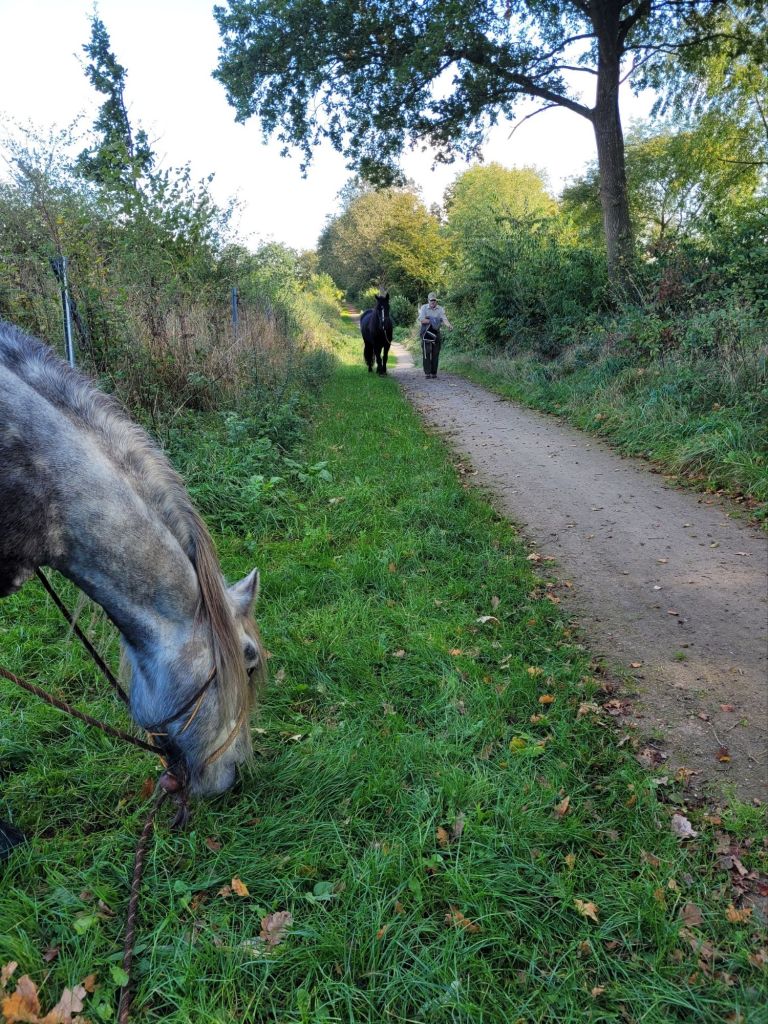 Mein Mädchen und ich sind wieder allein losgezogen. Diesmal ist sie gleich auf dem Hof aufgestiegen und hat mir gesagt, dass wir rechts vom Hof gehen. Wenn ich es nicht schaffe, hat sie versprochen, steigt sie ab. Aber ich hab das geschafft! Bin los gegangen, zuerst etwas zögerlich, aber es ging. Beim Nachbarn war ein bisschen Halligalli auf der linken Seite wo der Hengst ist. Und auf der rechten Seite war jemand auf dem Reitplatz. Da konnte ich mich gar nicht so richtig entscheiden, musste erstmal stehen bleiben. Aber nach ein bisschen gucken ging es weiter. Wir haben einen kleinen, fluffigen Trab eingelegt und sind einfach geradeaus in Richtung Dorf. Aber bevor man ins Dorf kommt, geht es rechts ab, da ist ein Grasstreifen auf dem wir reiten dürfen. Den bin ich auch noch fröhlich lang marschiert und als es gerade so richtig gut lief, hat mein Mädchen mich angehalten und ist abgestiegen. Grasen! Mmmmm das ist ja fein!