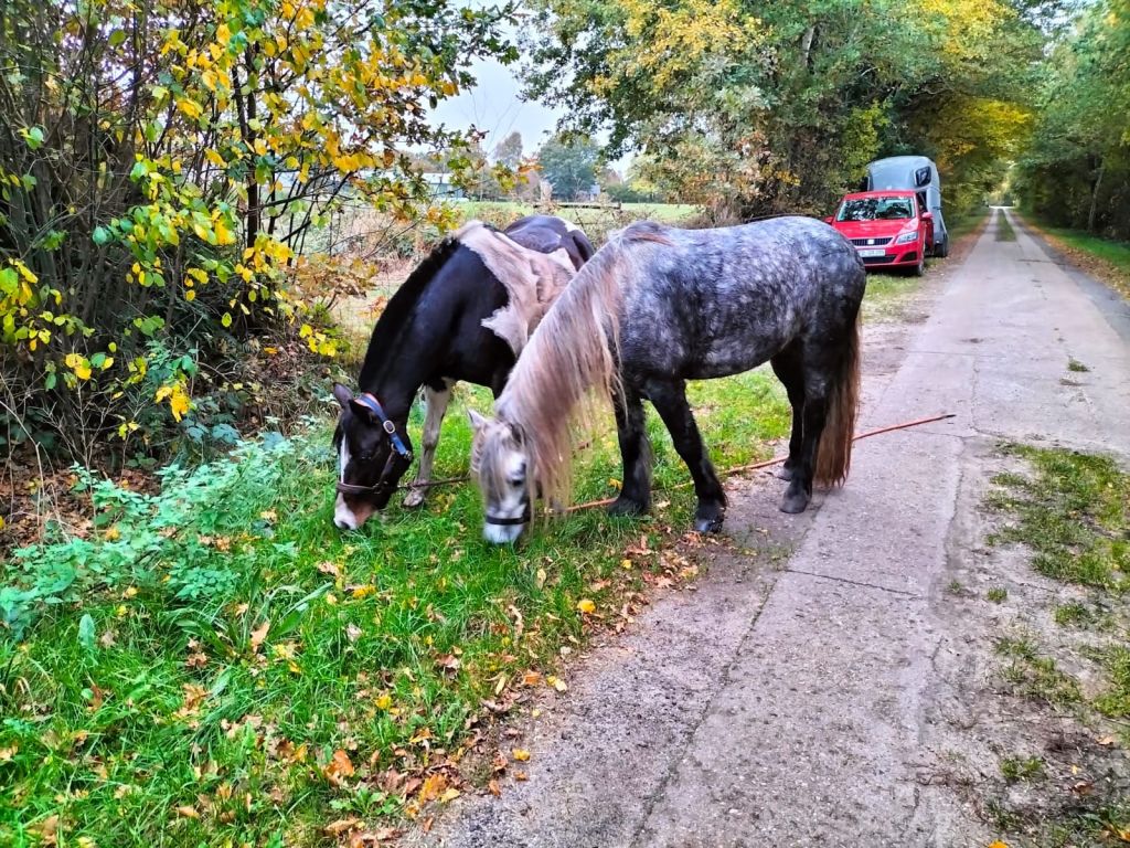 Alsbald danach waren wir dann auch schon wieder auf dem Rückweg und sind noch Richtung Wackelkiste getrabt. Bevor es ans Einsteigen ging, durften wir noch etwas grasen. Dann meinte das Mädchen vom Ausreitkumpel, er könne doch mal zuerst einsteigen. Oh das fand er aber gar nicht lustig! Er kann das prima, aber er fand, wenn ICH noch grasen darf, darf ER das auch und es kommt überhaupt nicht in Frage, dass er schon einsteigt und ich weiterschmause! Da gab es doch noch eine kleine Diskussion, aber schließlich hat er eingesehen, dass er wohl den kürzeren zieht, ist brav eingestiegen und ich dann natürlich auch. Ab nach hause!