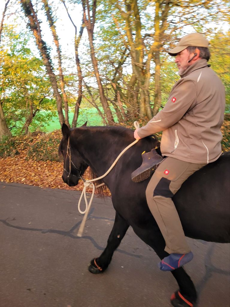 Dann wieder zusammen – links auf die Dorfstraße und den Heimweg angetreten. Als mein Mädchen und ich uns von unserer Extra-Tour erholt hatten, sind wir nochmal munter vorweg getrabt und dann alleine im Schritt weiter. Bisschen Schenkelweichen üben, lauschen ob Diego schon hinterher kommt, ja kam er. Weiter im Schritt. Komisch, die holen uns ja gar nicht ein? Na dann kann ich ja hier nochmal schön was grasen, das passt mir doch ganz gut. Da kommen sie ja! Aber was ist das? Der Mann war sockfuß unterwegs! Den drückten die Schuhe irgendwie. Mein Mädchen hatte Mitleid mit ihm und meinte, Diego könnte ihn doch das Stück nach hause tragen, die Tierärztin hat ja eh gesagt, er soll wieder ins Training kommen. Also ist der Mann auf Diegos Rücken geklettert und hat sich nach hause tragen lassen.
