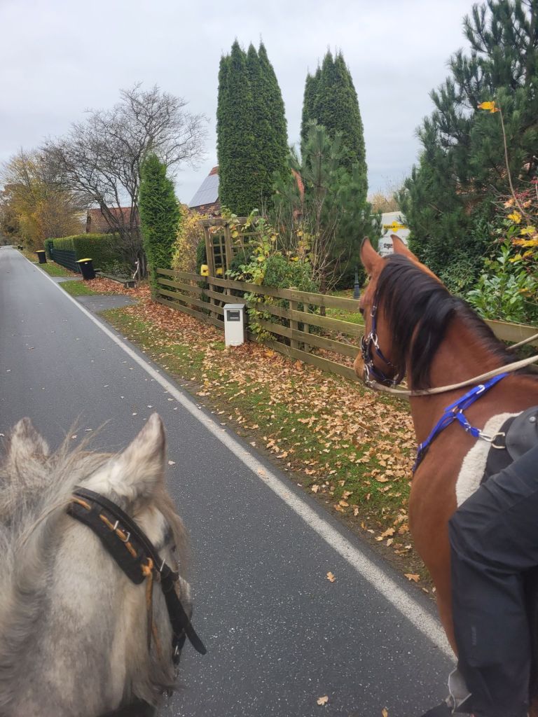 Dann Hufschuhe an und satteln. Oh, das sieht ja nach Ausritt aus, jetzt bin ich gespannt! Niemand sonst hier, gehen wir alleine raus? Plötzlich kommt da ein Pferd um die Ecke – auf unseren Hof rauf! Hm. Aber ich bin ja ein Guter, habe mich konzentriert und brav gewartet bis mein Mädchen aufgestiegen war und nachgegurtet hatte. Und dann sind wir mit dem fremden Pferd ausreiten gegangen! Jetzt war ich aber baff. Sowas ist mir ja noch nie untergekommen! Da war ich mir nun gar nicht so sicher, was ich davon halten soll. Mein Mädchen meinte, sie hätte doch eher damit gerechnet, dass ich aufgeregt und deswegen flott unterwegs bin, aber ich hatte Denkblockade. Ich war so mit dem fremden Pferd und der neuen Situation beschäftigt, dass keine Hirn-Kapazitäten mehr fürs Laufen frei waren. Mein Mädchen war maulig, weil sie meinte ich sei so klemmig, aber sie dachte sich schon, dass das ein Kopf-Problem ist. Es hat ein paar Kilometer gedauert, bis ich mich ein bisschen eingekriegt hatte, nachher ging es dann.