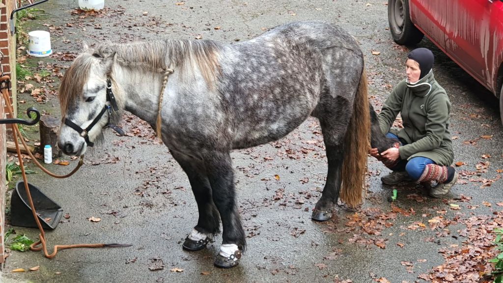 Aber bevor es los geht ist ja immer allerhand zu tun. Hufschuhe anziehen, weil es da doch ein Stück weit sehr steinig zugeht. Weil mein Mädchen nicht ganz zufrieden ist mit dem Sitz der Schuhe wollte sie die kleine Runde nutzen um was neues zu testen: Socken! So ein paar olle Tennissocken von ihr mussten herhalten. Die hat sie über meine Füße gezogen (das ging gerade so ganz knapp) und dann die Hufschuhe drüber. Sieht bisschen peinlich aus, aber wenn es funktioniert, kann ich ja vielleicht noch Ringelsocken bekommen, dann geht das wohl. Oder was in orange oder apfelgrün – na sehen wir mal. Beim Hufschuhe anziehen machen wir immer gleich noch eine kleine Dehnübung. Dann nimmt mein Mädchen mein Hinterbein und führt es vorsichtig nach hinten bis das Bein lang gestreckt ist. Aaaaaah das entspannt schön.
