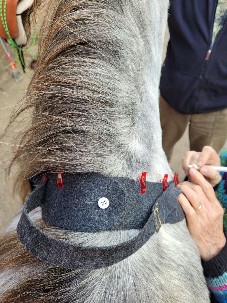 Außerdem brauchte sie meine Mähne offen, damit wir mein neues Equipment ausprobieren können! Speziell für Reiterinnen, die sich nicht so sicher sind und gern einen Griff zum festhalten hätten. Da war nämlich die Haus- und Hof-Schneiderin mal wieder fleißig am Werk und hat mir etwas passend auf den Leib geschneidert! Sie hatte mich zwischendurch mal besucht, sich über meine vielen weißen Haare gefreut (sie mag weiße Pferde) und mit fachmännischem Blick, Stecknadeln und kleinen Klemmen alles genau passend abgemessen. Dann hat sie es genäht und jetzt seht nur her! Mein Mädchen findet, es sieht ein bisschen aus wie eine Krawatte. Unten hat es ein dekoratives Herz, oben einen Griff für die Reiterin und einen kleinen Schlitz, durch den mein Mädchen ein paar meiner Mähnenhaare ziehen kann. Damit kann sie den Kragen festflechten, so dass er nicht nach unten rutscht wenn ich den Kopf runter nehme. Und weil das Teil so schön breit ist und den Druck gut verteilt, kann meine Reiterin sich herzhaft festhalten ohne dass es mich stört. Patent, oder?