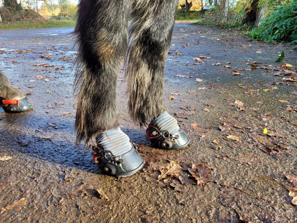 Wir haben dann nachher auch noch Frühstück bekommen und danach ging es los. Mein Mädchen hat etwas gegrummelt, denn in der Nacht hatte es viel geregnet und ich hatte mir danach ein schönes Schläfchen gegönnt und war somit dezent paniert. Aber zum Glück bin ich ja nicht empfindlich, also einfach das Gröbste abbürsten und dann trotzdem den Sattel drauf. Und die Schuhe an. Weil es Beschwerden gab wegen der weißen Tennissocken, die ich letztes Mal an hatte, hat mein Mädchen jetzt ein paar von ihren Ringelsocken genommen, die vorne ein Loch haben und deswegen für sie nicht mehr taugen, weil ihr sonst der große Zeh friert.