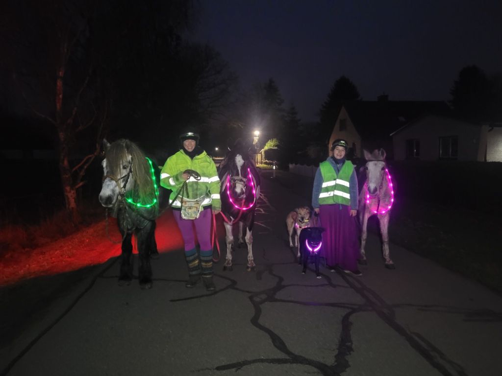 Mein Mädchen war sauer und sie war sogar froh, dass sie sauer war, sagt sie, weil sie sich sonst nämlich fürchterlich gefürchtet hätte. So war sie wütend genug um weiter zu reiten. Es wurde dunkel und wir haben uns alle gut beleuchtet. Ich könnte mich darüber aufregen dass es leuchtet und das als Anlass nehmen, nochmal etwas Gas zu geben, oder? Nein, da wurde sie da oben schon wieder fuchtig.