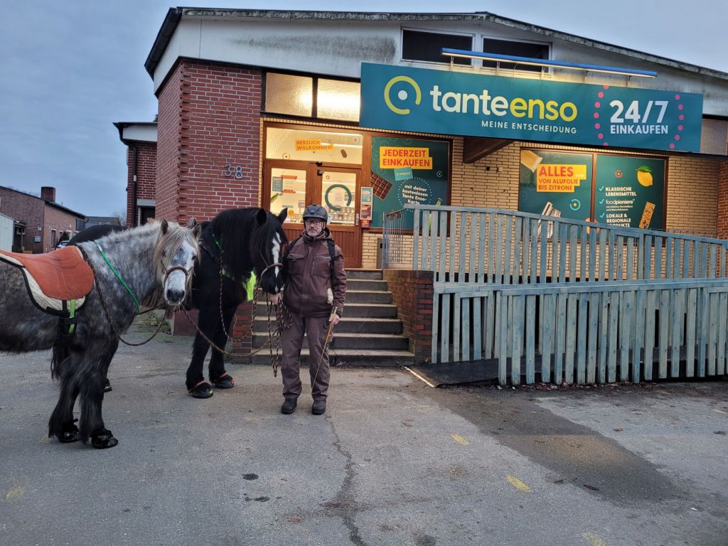 Hintenrum ins Dorf, dann hinterm Dorf rum. Und dann sind wir plötzlich in die falsche Richtung gelaufen! Wo wollt ihr denn hin, ihr Menschen? Nach ein paar Metern haben wir angehalten. Was ist das hier? Mein Mädchen sagt, das ist ein Einkaufsladen. Den gibt es seit ein paar Monaten neu im Dorf und dort kann man jederzeit einkaufen gehen. Und das war dran, denn es fehlten noch Plätzchenzutaten. Mein Mädchen ist also da rein gegangen, während der Mann mit uns draußen gewartet hat. Aber ach! Als sie wieder kam, war sie ganz betrübt. Sie wollte uns Möhren mitbringen, aber ausgerechnet bei den Möhren hat es mit dem kassieren nicht geklappt und sie musste sie dort lassen. Mist!