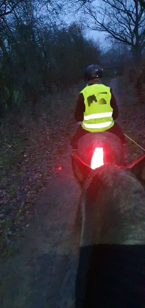 Bevor das passiert ist, war allerdings kurz gruseln angesagt. Zwei Jäger hatten sich getroffen und standen an der Straße und schnackten. Das allein fand ich schon beunruhigend, denn der eine trug dieses Outfit in Orange, was sie zur Treibjad tragen. Aber schlimmer war der Hund. Der saß in dem einen Auto, schob seine Nase durch den offenen Fensterspalt und bellte. Nein, das war mir zu viel. Habe auf dem Absatz kehrt gemacht, aber natürlich bin ich ein Guter und habe mich auf 2 Galoppsprünge beschränkt. Umgedreht, wieder hin. Mein Mädchen hat mir gut zugeredet. Hm. Vielleicht… .nein! Das ist mir wirklich zu gruselig! Sogar Diego hat einmal hingeschaut und das will was heißen! Ich wieder auf dem Absatz kehrt. Da ist mein Mädchen abgestiegen und hat mich freundlicherweise vorbei geführt. Ok wenn sie neben mir geht, kann ich das. Puh. Danach sind wir beide ein Stück zu Fuß gegangen. Mein Mädchen fand das auch alles gruselig, weil ich so angespannt war. Schließlich ging es wieder und ich sie ist wieder rauf gehüpft. Weiter im Turboschritt. Flinke Füße! Mein Mädchen fand, ich fühle mich immer noch angespannt an, aber technisch gesehen habe ich alles ganz richtig gemacht und sie hat mich ordentlich angefeuert, dass ich meinen allerschnellsten Schritt gehen soll. Ein paar mal mussten wir trotzdem nachtraben, da hab ich dann mal vorgeschlagen, wir könnte auch…. nein, nicht erlaubt. Schneller Schritt!! An manchen Stellen hatte ich tatsächlich die Chance, etwas aufzuholen. Da, wo es rutschig ist, bin ich nämlich im Vorteil! Mein Schwerpunkt liegt tiefer und meine Beine sind nicht so lang. Ich bin kompakt gebaut, da kann ich schneller über glitschige Matsche laufen als Diego, der mit seinen langen Gräten teilweise doch ganz schön ins Schliddern kam.