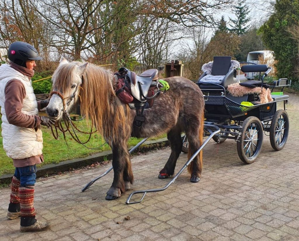 So, ein Abenteuer war ja für heute versprochen, da habe ich mich gleich morgens am Stalltor eingeparkt und alles ganz genau beobachtet. Mein Mädchen hat allerhand Zeug ins Auto geräumt, unter anderem meinen Sattel. Juhuu! Dann hat sie mich rausgeholt und mir die vorderen Hufschuhe angezogen. Aber dann war alles falsch: wir sind nur am Halfter mit der Longe auf den Reitplatz gegangen und ich sollte eine Runde traben und eine Runde galoppieren und schon war der Spaß vorbei! Hey! Das ist doch kein Abenteuer! Also habe ich weiter am Stalltor gestanden. Und siehe da: die Wackelkiste kam zum Vorschein. Na geht doch! Ich durfte einsteigen und los ging es. Wo wir wohl hinfahren? Ach, da ist ja Ritter Willibald! Aber der stand im Paddock und mümmelte Heu. Am Anbinder stand seine Frau Eria, eine große Scheckstute. Und in der Einfahrt stand eine Kutsche! Der Mann hat dann mit dem Mädchen von Eria das ganze Fahrgeschirr an sie dran getüddelt, während mein Mädchen mich gesattelt hat. Weil der Mann ja noch keine Ahnung hat, hat er sich alles zeigen und erklären lassen – das hat vielleicht gedauert! Ich stand derweil mit meinem Mädchen da so rum. Hab mir mal die Kutsche angeschaut und durfte mal Willis Fahrgeschirr anprobieren (der kann nämlich auch die Kutsche ziehen, nur heute hatte er frei).