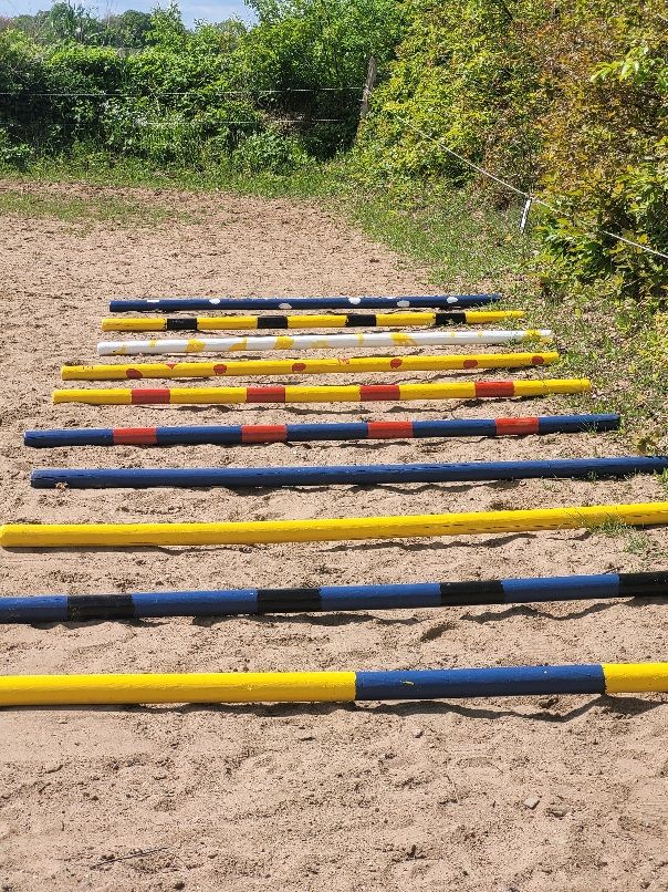 Mein Mädchen war fleißig. Sie hat unsere Stangen gestrichen und noch 5 neue Stangen dazu. Jetzt haben wir 10 knallbunte Stangen, jede sieht anders aus, damit man sie ganz klar voneinander unterscheiden kann. Das ist wichtig, wenn sie mit Reitschülern Lenken üben möchte, damit sie sagen kann wo es langgehen soll.