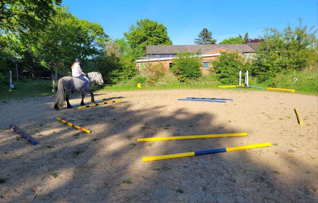 Am Freitag kam meine kleine Freundin. Für die hat mein Mädchen dann einen Kreis aus Stangengassen aufgebaut – naja ein 5-eck. Und zwar eines nach ihrer Art, also nicht gerade akkurat…. aber egal. Meine kleine Freundin sollte mich da durch lenken. Hat sie schon ganz gut hingekriegt! Dann hat mein Mädchen vorgeschlagen, wir könnten das doch mal im Trab probieren. Meine kleine Freundin war erst nicht ganz überzeugt, aber dann hat sie gesagt, wenn mein Mädchen macht, dass ich trabe, dann könnte sie das lenken übernehmen. Ach, ihr kennt mich, ich bin Gentleman. Ich habe den Job für sie gemacht und bin ganz fein durch die Gassen getrabt. Sie hat schön gesessen und es genossen. So muss das sein! Schließlich ist sie meine Freundin und hat danach einen Tupper voller Möhrenstücke für mich. Und wisst ihr was toll ist? Sie vertraut mir jetzt schon richtig gut. Sie kann auch schon traben ohne sich an meiner „Krawatte“ festzuhalten!