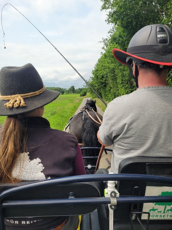 Während ich viel beschäftigt bin mit Ausreiten, alleine Ausreiten (ohne alleine Auszureiten), Reitschülerinnen unterrichten, springen üben und ähnlichem hat Diego den 2. Bildungsweg eingeschlagen. Er lernt jetzt das, was mein Mädchen mir immer noch nicht zutraut (pah!) weil ich angeblich noch nicht erwachsen genug bin (Unterstellung!): das Kutsche-ziehen. Ich glaube ja nicht, dass das so kompliziert ist, ehrlich gesagt. Man läuft doch da auch nur geradeaus und biegt an einer Kreuzung rechts oder links ab. Was soll daran schwer sein?