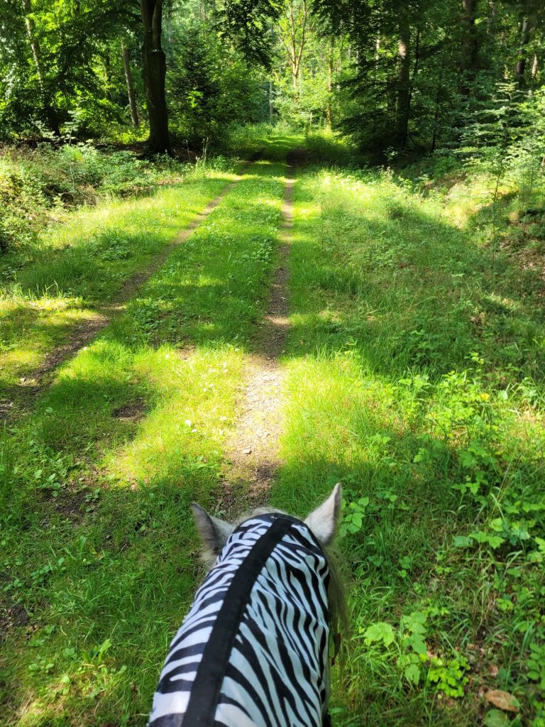 Mein Mädchen war gerade so richtig stolz auf uns beide, als wir dann am Waldrand ankamen. Und dort lauerten sie uns auf – die Insektenschwärme! Mein Mädchen hatte darauf verzichtet, mir meine nigelnagelneue Fliegenmaske aufzusetzen, weil ich die ja beim Ausreiten noch nie aufhatte und sie dachte, es könnte mich irritieren. Aber jetzt hat sie das bitter bereut und meinte, ganz sicher hätte mich die Maske sehr viel weniger gestört als diese Heerscharen von allen möglichen Fliegviechern, die uns jetzt verfolgten. Wenigstens hatte ich meine Zebradecke auf, so dass sie sich auf meinen Kopf beschränken mussten. Aber es war wirklich nicht schön! Wir sind die ganze Zeit getrabt, aber die Mistviecher haben das Tempo einfach mitgehalten. Das hat mir einiges an Tapferkeit abverlangt und mein Mädchen hat sich dauernd bei mir entschuldigt. Da sie noch nicht auf Sommer eingestellt ist, hatte sie auch kein Fliegenzeug an Bord, das hat sie sonst immer noch in der Satteltasche mit. Sie hat noch viel zu lernen!