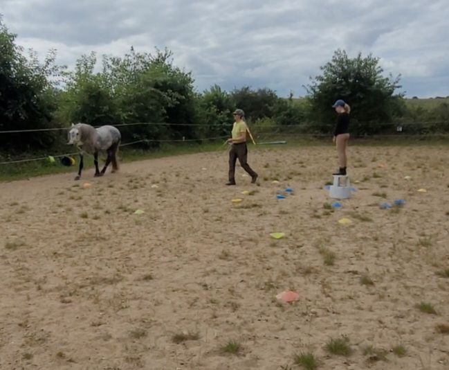 Am Donnerstag kam dann meine winzig kleine Freundin wieder mal, die hab ich ein paar Wochen nicht gesehen. Sie hat immer noch ein bisschen Angst vor mir – obwohl ich doch so ein Guter bin! – also hatte mein Mädchen sich ein Spiel überlegt. Meine kleine Freundin steht auf einem Hocker in der Mitte vom Reitplatz und mein Mädchen longiert mich um sie herum. Auf dem Boden lagen bunte Hütchenkreise in verschiedenen Abständen und meine winzige Freundin hat immer angesagt, welche Kreisfarbe ich laufen soll. Als das im Schritt gut geklappt hat, hat mein Mädchen einen kleinen Trab vorgeschlagen. Meine winzige Freundin hat mich genau beobachtet. Sie wusste immer, wann ich trabe und wann ich Schritt gehe, aber woher sie das weiß, konnte sie nicht sagen. Mein Mädchen hat ihr dann erklärt, dass das an der Art liegt, wie ich meine Beine sortiere. Ich als Pony darf da nicht zu viel drüber nachdenken, sonst geht es mir nachher wie dem Tausendfüßler, der plötzlich nicht mehr tanzen konnte, weil er darüber nachgedacht hat, wie er seine tausend Füße sortieren muss! Nein nein das ist nicht gut. Aber meine winzige Freundin hat konzentriert auf meine Beine gestarrt. Dann hat mein Mädchen mich galoppieren lassen – einmal links herum und einmal rechts herum. Ob meine winzige Freundin wohl etwas bemerkt hat? Nein, hatte sie nicht. Da hatte mein Mädchen eine Idee und hat mir ihr eigenes Halstuch um mein rechtes Vorderbein gewickelt. So sehen meine Beine unterschiedlich aus. Dann hat sie mich wieder galoppieren lassen, einmal links herum und einmal rechts herum. Und da hat meine winzige Freundin herausgefunden, dass mein rechtes Vorderbein weiter vor geht, wenn ich rechts herum galoppiere. Und wenn ich linksherum galoppiere, geht mein linkes Vorderbein weiter vor. Das fand sie sehr interessant. Ich hab mich erinnert, dass ich das auch erst lernen musste, als ich noch kleiner war. Da hab ich manchmal doch den anderen Galopp erwischt, aber damit ist die Kurvenlage halt echt schwierig. Rechts galoppieren und dabei links um die Kurve haut echt nicht gut hin.