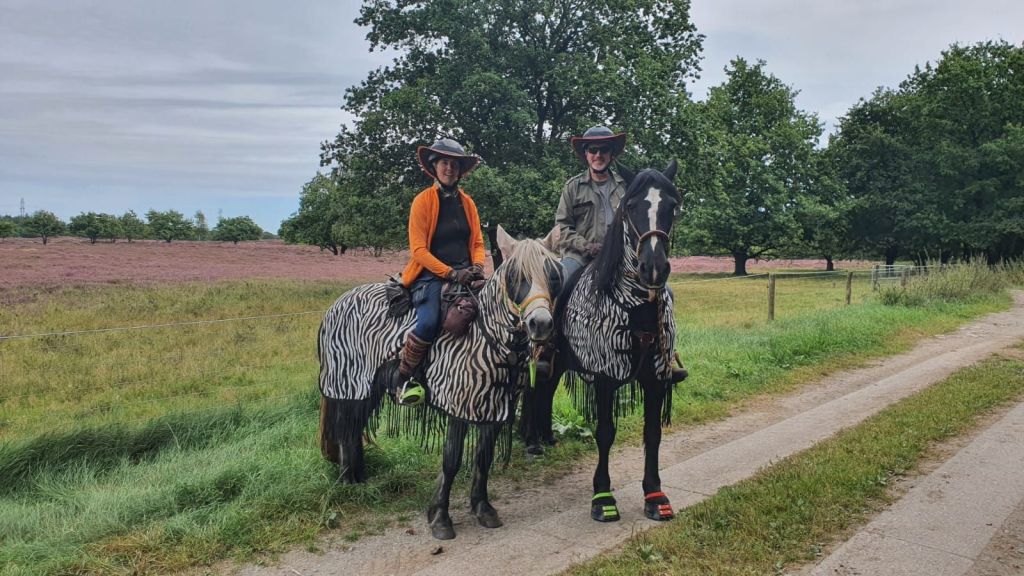 Nachdem das erledigt war, ging es dann richtig los. Auf dem Sandweg durch die Heidelandschaft, dann ein Stück Plattenweg, ein erster kleiner Trab. Und dann auf den schönen Grasweg. Keine Spaziergänger in Sicht, also im Trab voran, Diego vorneweg. Und da zahlt sich das mit dem Kutsche fahren jetzt aus: er kann jetzt ganz fein gleichmäßig durchtraben! Das passte mir und meinem Mädchen sehr gut in den Kram.