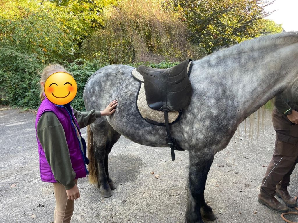Am Ende hat meine winzige Freundin sich dann sogar noch getraut, ohne Hocker abzusteigen, das hat sie noch nie versucht! Und als wir wieder vorne auf dem Hof waren, hat sie mich gleich nochmal gestreichelt und wollte gern nochmal mein kleines Extra-Stück Zahnfleisch in meinem Maul sehen.