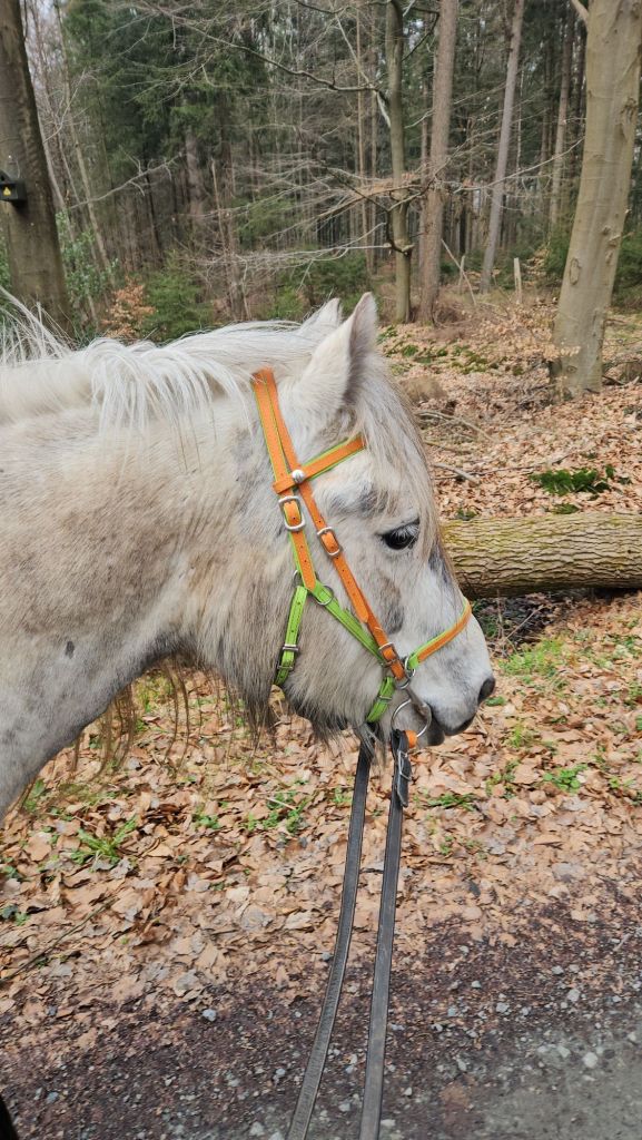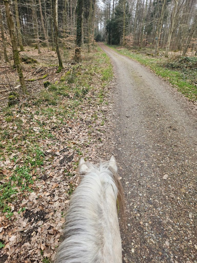 Nach 10 Minuten zu Fuß kamen wir an eine gute Aufsteigestelle und mein Mädchen ist auf meinen Rücken gehüpft. Und schon ging es los! Sie hat mir eine paar Einlegesohlen in meine vorderen Hufschuhe gelegt, damit ich gut geschützt bin vor den vielen spitzen Steinen, die leider in unserem Sicherheitswald überall liegen.